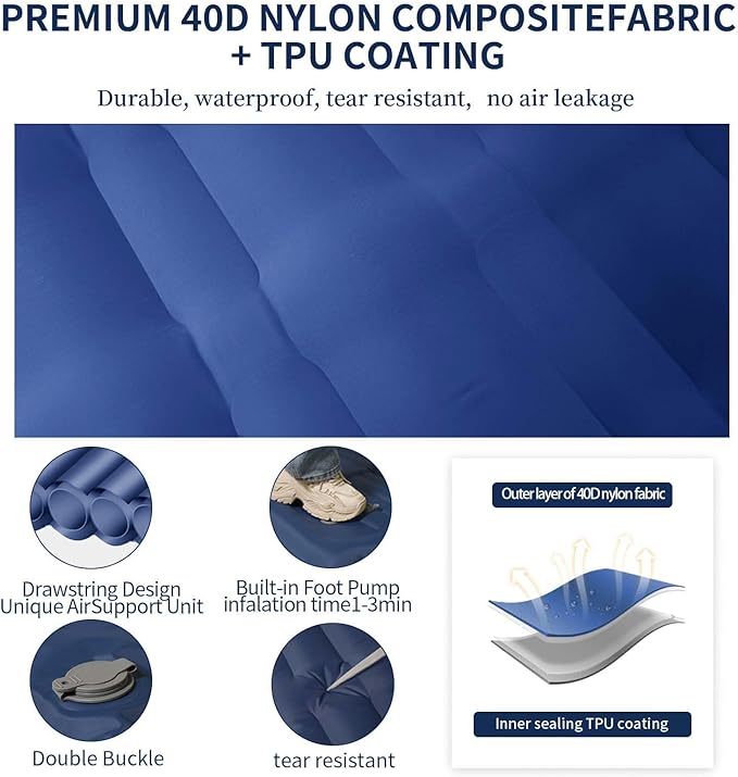 - TOP COMFORTABLE AND DURABLE: Our sleeping pad is made of ultra-tough 40D nylon coated with water-resistant TPU, durable and tear-resistant. This camping pad also features unique drawstring support technology. The air support units independently deform to conform to your body's curves and distribute gravity, and can hold up to 800 pounds of pressure when fully inflated. The edges of the camping air mattress are heat-sealed so you don't have to worry about air leaks or tears.