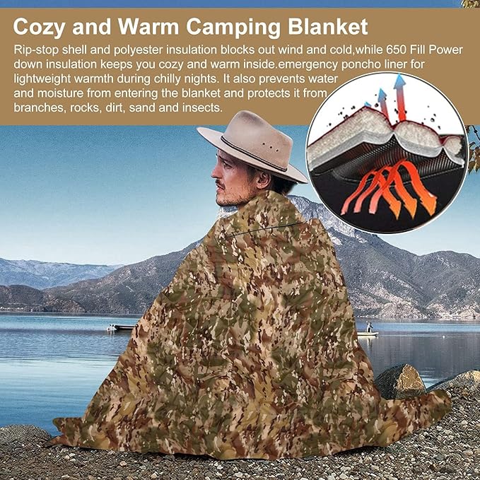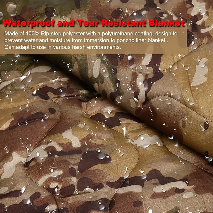 - 【Measurements and Material】Size:this Poncho Liner is approximately 82 1/2 * 60 inches total length and weighs 2.2 pounds.Material:this milittary blanket made of 100% Rip-stop polyester,Ensure a secure and long-lasting usage everyday