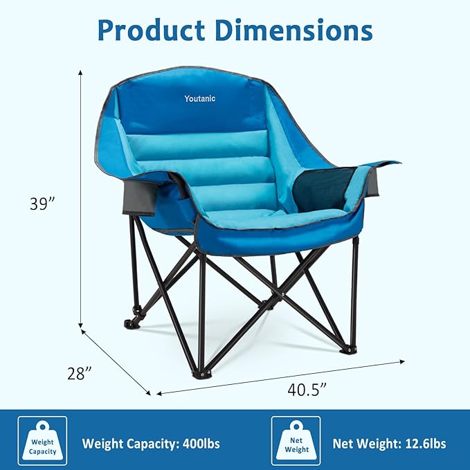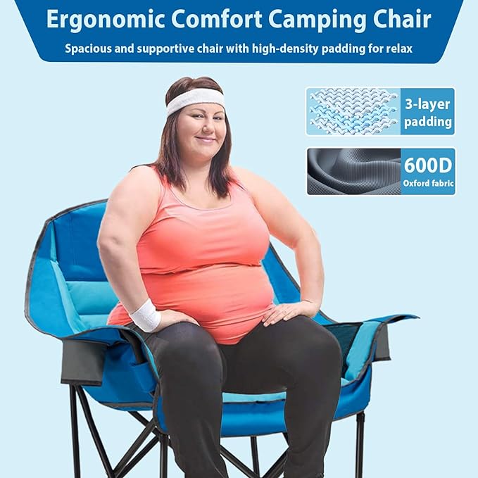 - Extremely Comfortable: Our camping chairs for adults heavy duty, designed with ergonomic principles, feature spacious seats with unfolded dimensions of 40.5'' L x 28'' W x 39'' H. The Camping Folding Chair is filled with high-loft, high-density padding in areas such as the headrest, backrest, armrests, and seat cushion, providing ample space and support for your head, neck, back, waist, and hips. This ensures a comfortable experience even during prolonged sitting