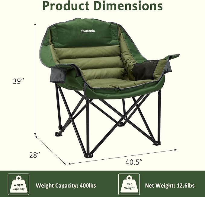- Extremely Comfortable: Our camping chairs for adults heavy duty, designed with ergonomic principles, feature spacious seats with unfolded dimensions of 40.5'' L x 28'' W x 39'' H. The Camping Folding Chair is filled with high-loft, high-density padding in areas such as the headrest, backrest, armrests, and seat cushion, providing ample space and support for your head, neck, back, waist, and hips. This ensures a comfortable experience even during prolonged sitting