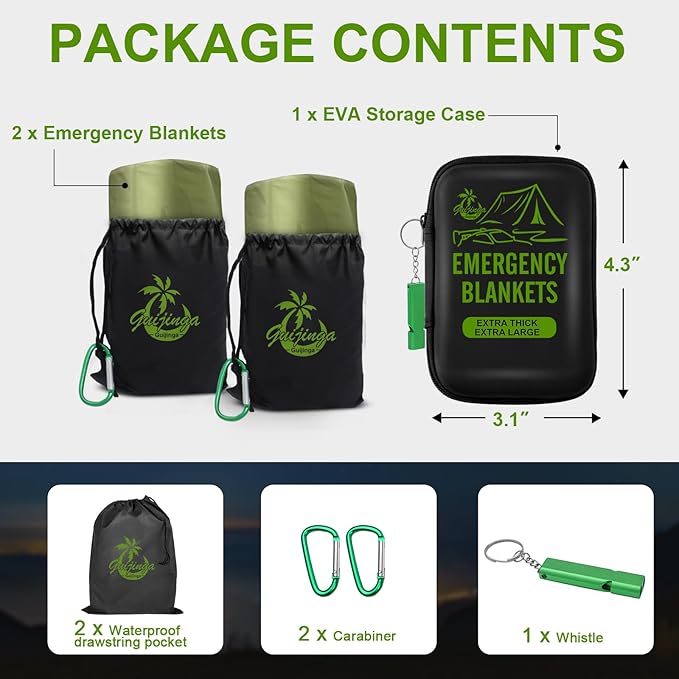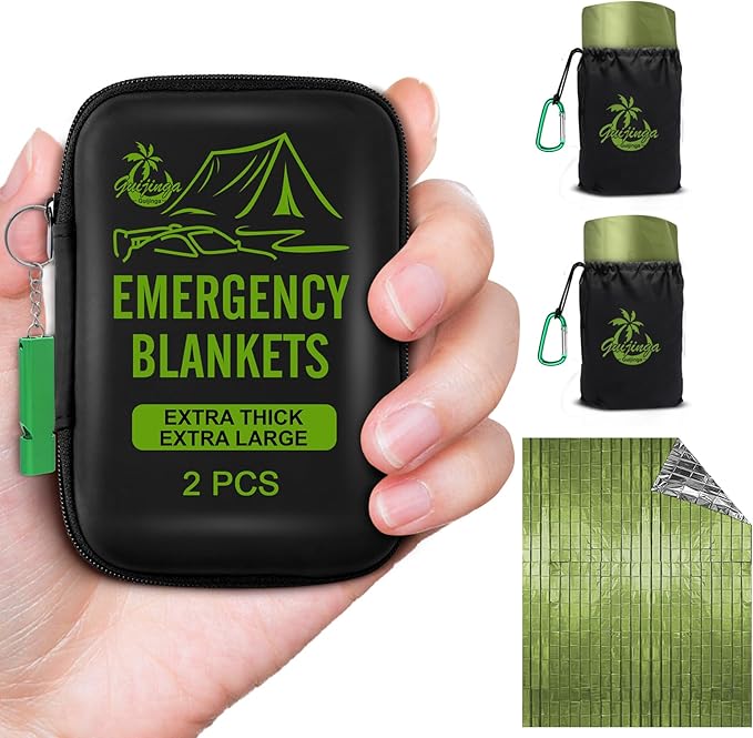 - 🔥【Extra Large & Extra Thick】: Guijinga products are 23% larger than other emergency blanket for car, offering 2-pack or 4-pack of 83" x 63" emergency blanket. survival blanket Made of premium PE material, they ensure durability and longevity, and sol emergency blanket 26-micron ultra-thick structure provides tear resistance, allowing you to protect yourself in harsh conditions.