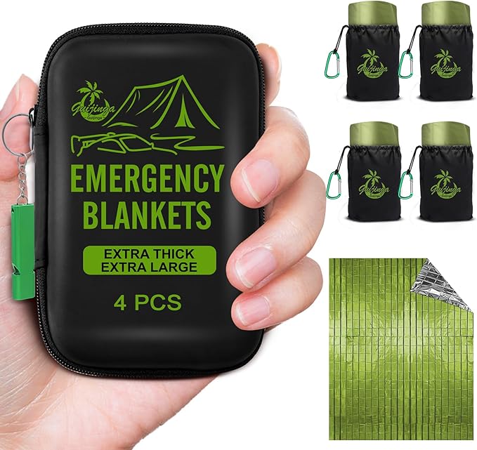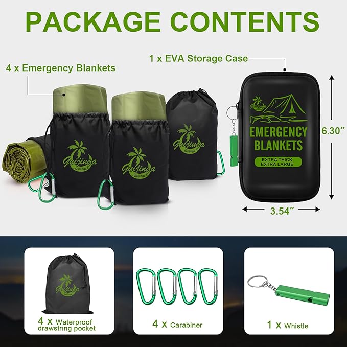 - 🔥【Extra Large & Extra Thick】: Guijinga products are 23% larger than other emergency blanket for car, offering 2-pack or 4-pack of 83" x 63" emergency blanket. survival blanket Made of premium PE material, they ensure durability and longevity, and sol emergency blanket 26-micron ultra-thick structure provides tear resistance, allowing you to protect yourself in harsh conditions.
