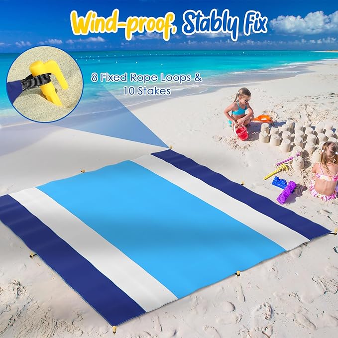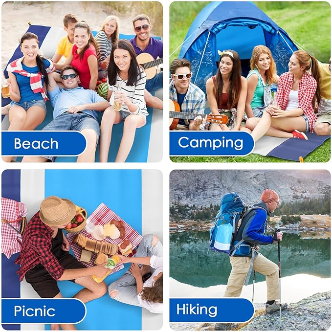 - 【Multiple Uses】The large beach blanket can be easily folded and carried anywhere in a backpack, car, or suitcase. Ideal for family traveling, hiking, camping, and other activities. A versatile beach essentials for vacation, the set includes: 1 x beach mat, 1 x storage bag, and 10 x ground stakes.