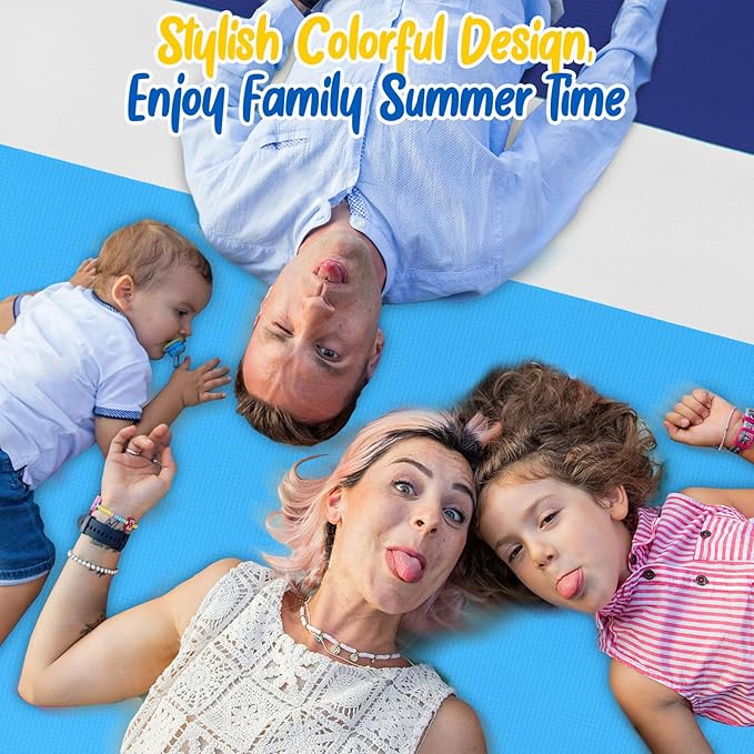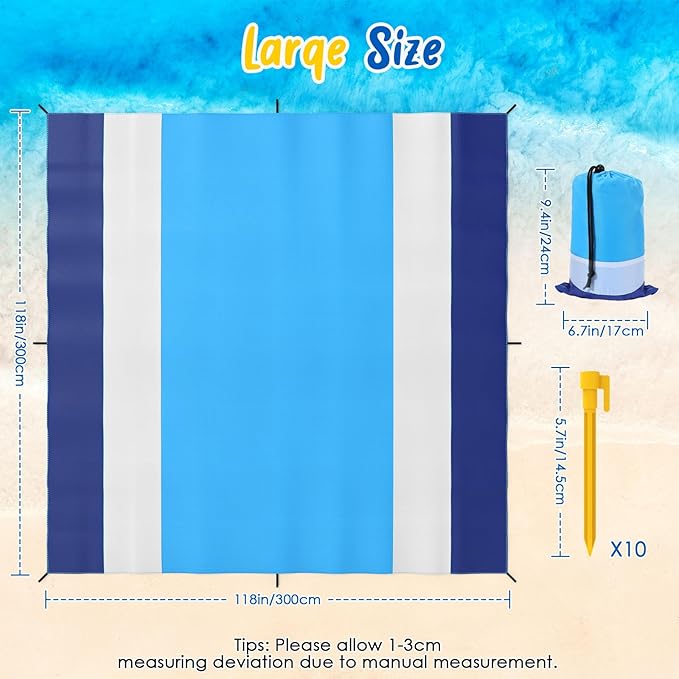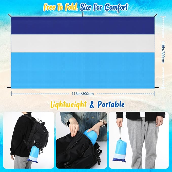 - 【Extra Large Beach Blanket】Oversized beach mat size is 118" x 118" / 300 x 300cm, perfect for your family or friends to relax on the beach. Great for sports activities and outdoor entertainment, a picnic mat is a must-have for all your summer activities. Lightweight and compact when folded, you can fold it into the included storage bag for easy portability.