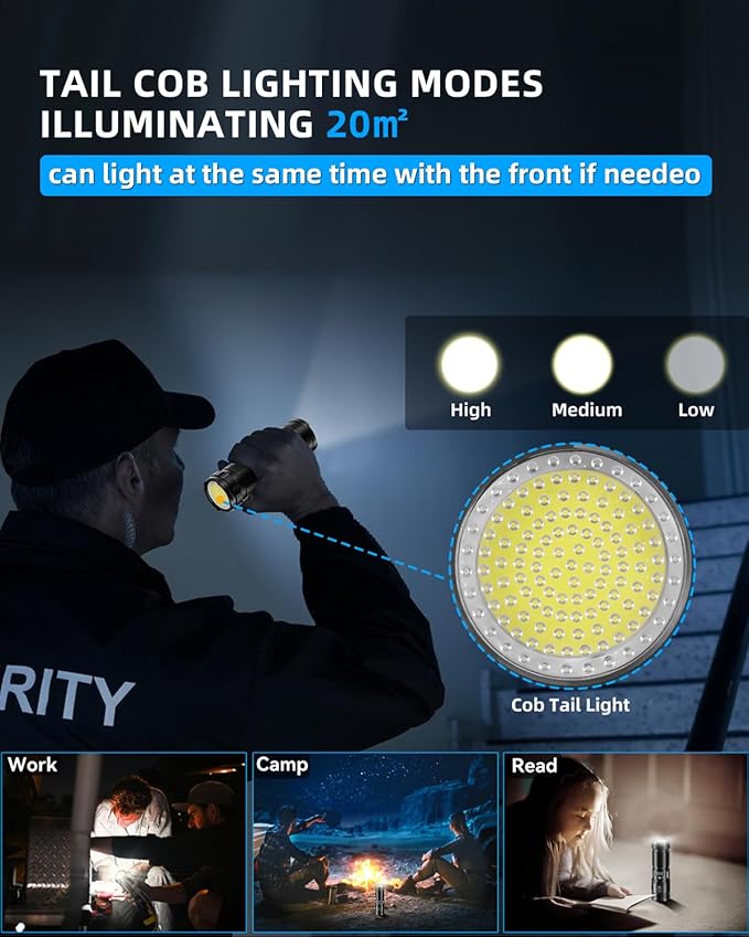 - ✅🔦ADJUSTABLE & 8MODE FLASH LIGHT -- This flash light high lumens features different 8 lighting modes for front and rear lighting-Front Main Light: Low/Mid/High/a strobe mode for emergency situations, Tail COB Work Light: Low/Mid/High(with a long-press-to-turn-off function). A HIDDEN SUPER BRIGHT MODE IS ACCESSIBLE BY DOUBLE-CLICKING.This multi-functional flash light rechargeable usb is perfectly suitable for both outdoor adventures and daily use!