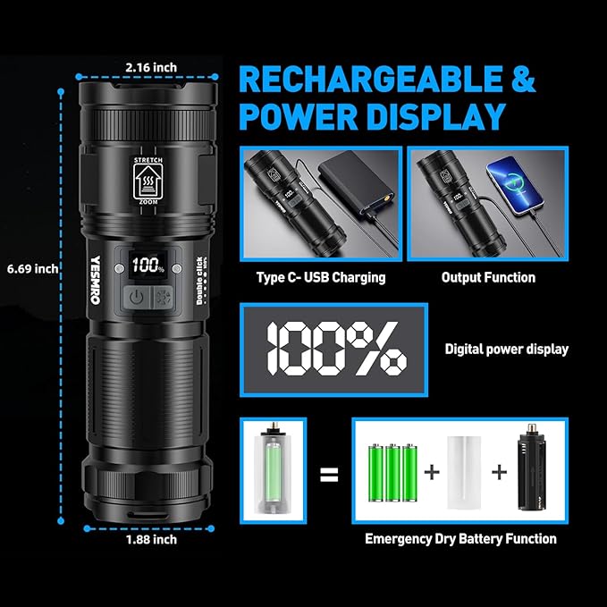 - ✅WITH MULTI-FUNCTIONAL DESIGN - With help of the built-in 9000mah off battery it can be used as more.[1] With USB output port, brightest flashlight can be used to charge electronic device IN EMERGENCIES.. [2] With head cusp design, tactical flashlight can be used as safety hammer. [3] With dry battery function, flash light can be used for emergencies.