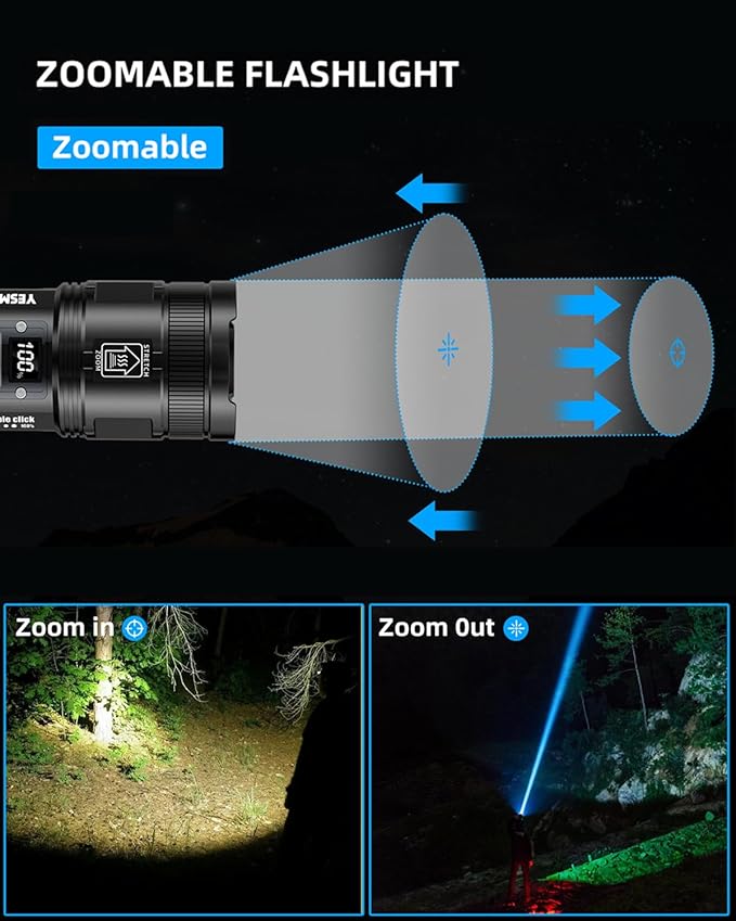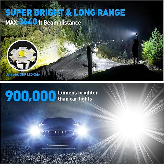 - ✅🔦MOER LONG RANGE Flashlights High Lumens--With a 120,000 lumens upgraded XP90 LED chip, this bright outdoor hunting flashlight can illuminate from both front and rear ends. The zoomable is adjustable from wide to narrow.More ultra-wide beam would light up an entire room, a broad backyard, or even a football field!With a maximum illumination distance of 1500m, this could be an ideal helper for emergencies, camping, night hiking, fishing, and hunting