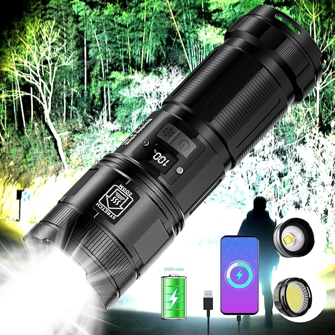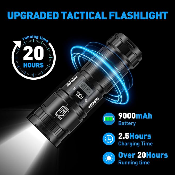 - ✅🔦LED FLASHLIGHT RECHARGEABLE & 12H ENHANCED RUNTIME-- Newly Upgraded for reduced charging time and extended lighting time, this rechargeable tactical flashlight delivers up to 12 hours of continuous use. The flashlight have a power indicator to show the remaining battery life.Its unique digital display SHOWS BATTERY PERCENTAGE, eliminating guesswork about remaining power.