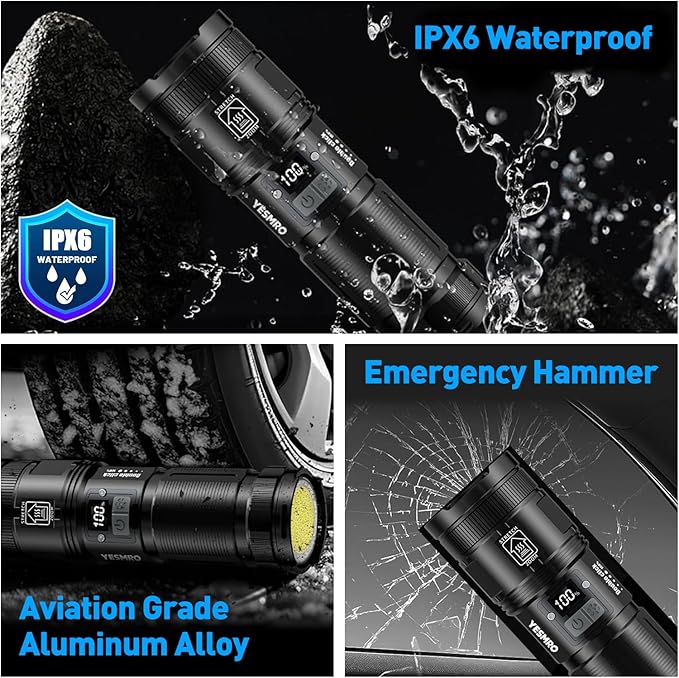 - ✅🔦WATERPROOF Durable ALUMINUM ALLOY-- Crafted from Military-Grade aluminum alloy, this IPX6 waterproof linterna is engineered to withstand rough handling, including 16-foot drops or temporary submersion in water. It operates flawlessly in adverse weather conditions such as heavy rain and snow, making it ideal for either household or outdoor occasions.