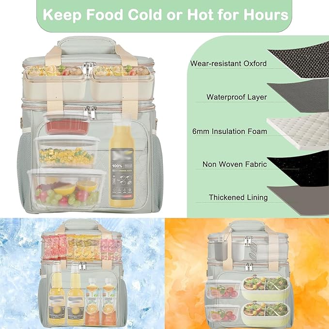 • Large Capacity with Expandable Design: Fits 20 Cans of soda(350ml). Dual Compartments for different uses, the top compartment of the women lunch box is expandable, increasing the capacity by 4L. Normal size with 12L. Handy to use for work, outing, picnic, camping, road trip, and so on