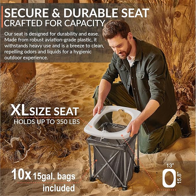 - 【Foldable XL Seat】 - Unfolds in a single motion for speedy setup. These camping toilet's portable design includes an extra-large seat for home-like comfort. An ideal porta potty for adults.