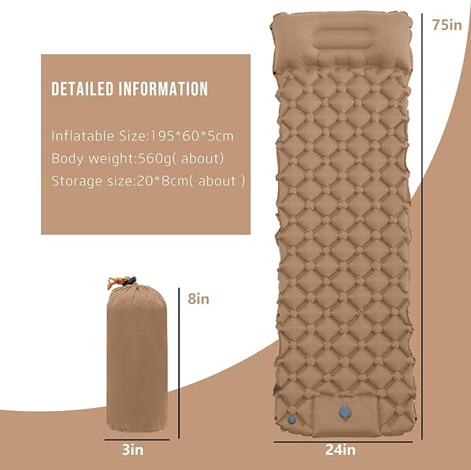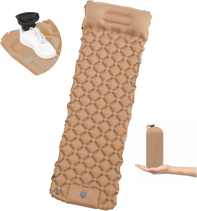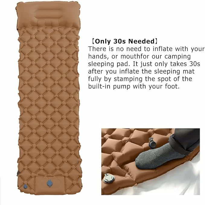 - 【Foot Press to Inflate-Only 30s Needed】There is no need to inflate with your hands, or mouthfor our camping sleeping pad. It just only takes 30s after you inflate the sleeping mat fully by stamping the spot of the built-in pump with your foot.With anti-leakage films in the valves, you would never worry about air leaking when using it !