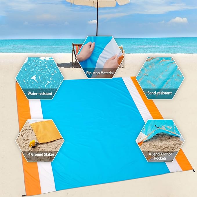 - 【4* SAND POCKETS & 4 *ANCHOR STAKES 】 There are 4 triangle sand pockets at the corners of the beach mat, so you can put sand or rocks in these sand pockets to keep the blanket on ground or you can use the stakes to nail it down