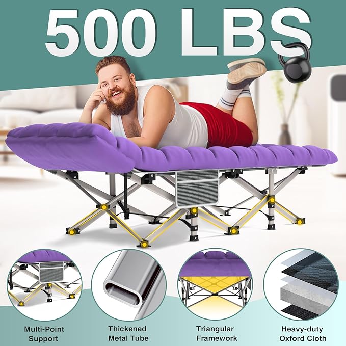 - 【Sturdy and Stable】Feel confident resting on a camping cot bed designed to support up to 500 lbs. The enhanced structure boasts 10 tubular iron legs with 25 mm thick flat round square tubes, ensuring uniform force distribution for a stronger, more stable sleep. The non-slip plastic nubs keep the cot secure on any terrain, ensuring a safe, worry-free slumber under the stars.