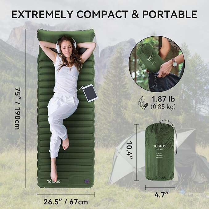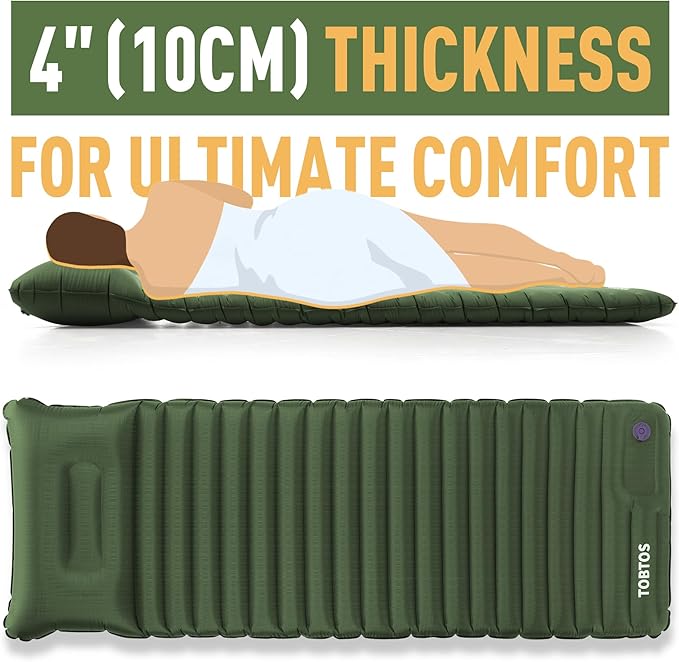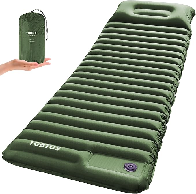 TOBTOS Inflatable Sleeping Pad for Camping with Pillow, 4" Thick Camping Mat with Built-in Foot Pump, Compact Air Mattress for Camping, Hiking, Backpacking (Green)