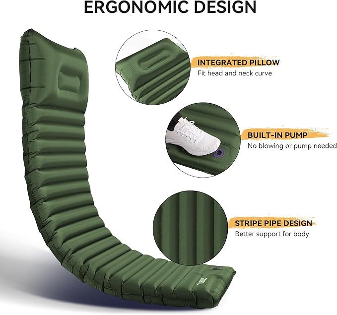 - ERGONOMIC DESIGN: Camping sleeping pad comes with a built-in pillow that relieves pressure on your back and neck, making it comfortable to sleep on your back or side. The smooth tube design evenly supports your body's pressure points