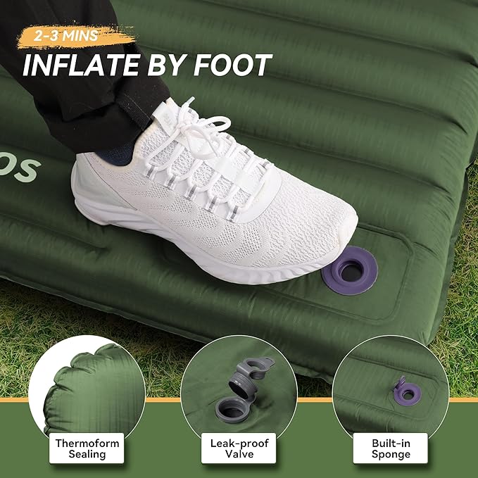 - EASY INFLATE & DEFLATE: No more blowing your camping mat with your mouth! It has a built-in foot pump that allows you to inflate it with your feet in 2-3 minutes. Simply open the deflation valve and it will deflate in seconds