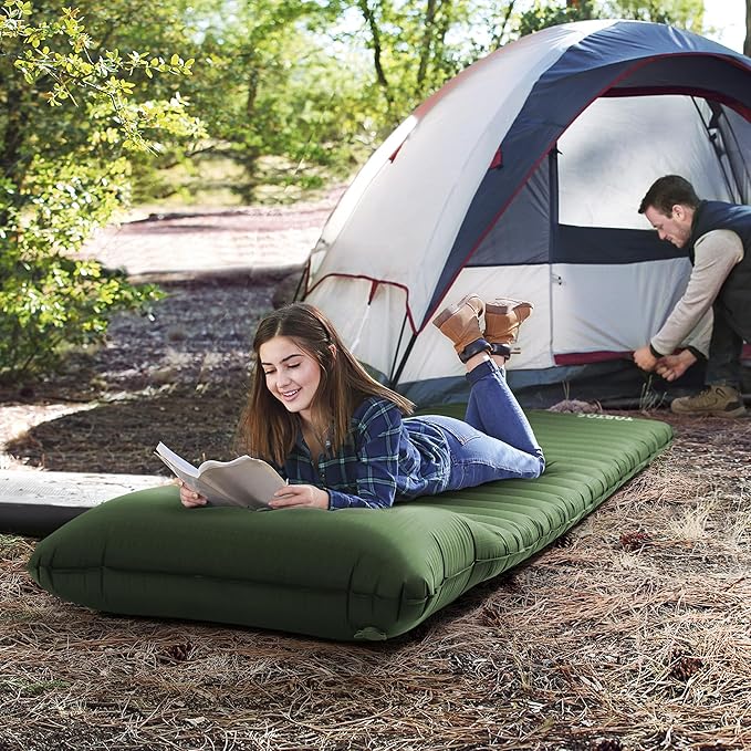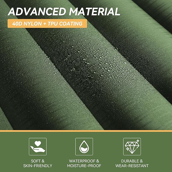 - CAMPING GRADE FABRIC: This sleeping pad is made of super tough 40D nylon with TPU coating that completely insulates it from moisture. The edges of the camping pad are heat sealed, you don't have to worry about air leaks or tears