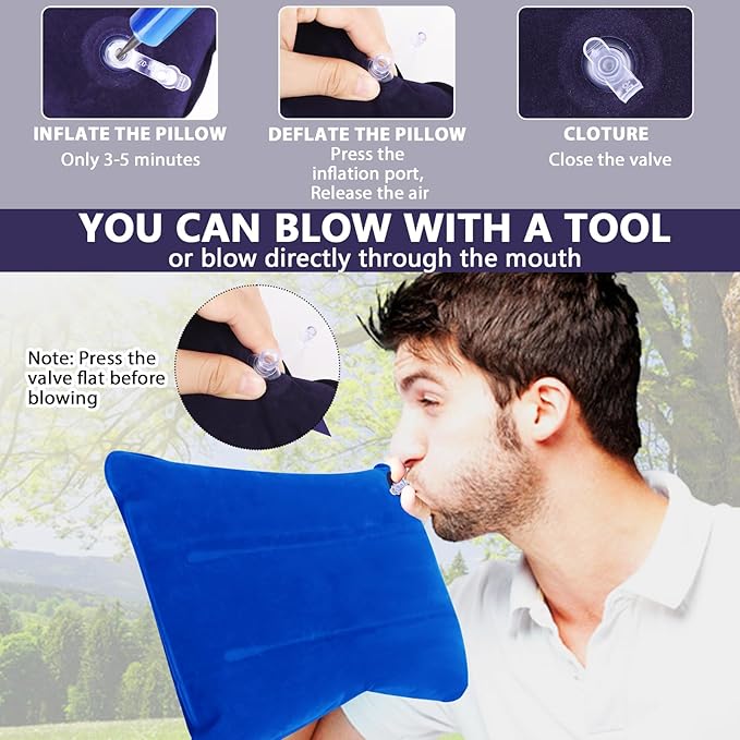 - 🏞️ 🔄 𝐈𝐍𝐅𝐋𝐀𝐓𝐀𝐁𝐋𝐄 𝐃𝐄𝐒𝐈𝐆𝐍 𝐅𝐎𝐑 𝐂𝐎𝐌𝐏𝐀𝐂𝐓 𝐒𝐓𝐎𝐑𝐀𝐆𝐄: 🏞️ 🔄 The inflatable camping pillows for backpacking inflatable design allows for a quick and easy setup, you can blow by mouth or inflate with a pump for 3-5 minutes and you'll have a soft, comfortable pillow! When not in use, the pillow can be deflated for easy storage and convenient for traveling and camping.