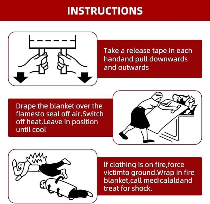 - 【EASY TO USE】 Simply pull out the fire blanket,spread the blanket wide and slowly cover the blanket on the fire.Turn off the stove or any fire source. Until the blanket suffocate the fire.Waiting for the blanket to cool and then remove .Or you can wrap it around your body to avoid any unnecessary burning injuries.