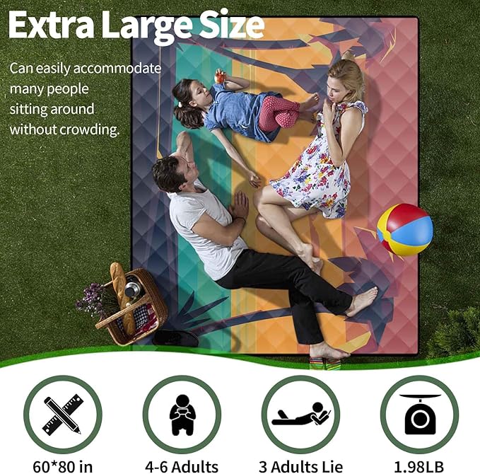 - 【Extra Large Picnic Blankets Size】 Our picnic blanket has an unfolded size of 60*80 inches, which is spacious enough to accommodate 4-6 adults. Whether you're spending quality time with family, friends, or loved ones, this wide area will provide enough space for everyone to enjoy the outdoor picnics.