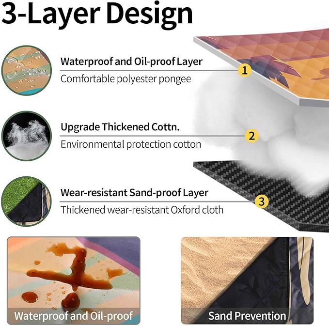 - 【Three-layer Structure】 We understand the importance of comfort and moisture resistance for outdoor activities. Therefore, the picnic mat adopts a three-layer design: the top layer is waterproof, the middle layer is soft cotton, and the bottom layer is also waterproof. This structure not only ensures the comfort of the cushion but also provides moisture resistance, allowing you to always enjoy a dry and comfortable sitting posture.