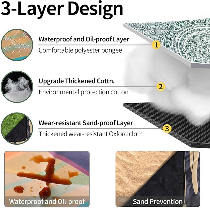 - 【Three-layer Structure】 We understand the importance of comfort and moisture resistance for outdoor activities. Therefore, the picnic mat adopts a three-layer design: the top layer is waterproof, the middle layer is soft cotton, and the bottom layer is also waterproof. This structure not only ensures the comfort of the cushion but also provides moisture resistance, allowing you to always enjoy a dry and comfortable sitting posture.
