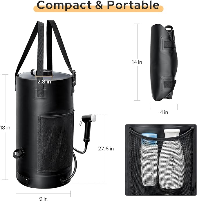 - Portable Shower Bag-Capacity up to 5 gallons/20L with a large storage mesh Pocket, lets you enjoy a better and refreshing shower anywhere. compact and lightweight design that you can carry it in luggage, backpack, car trunk.