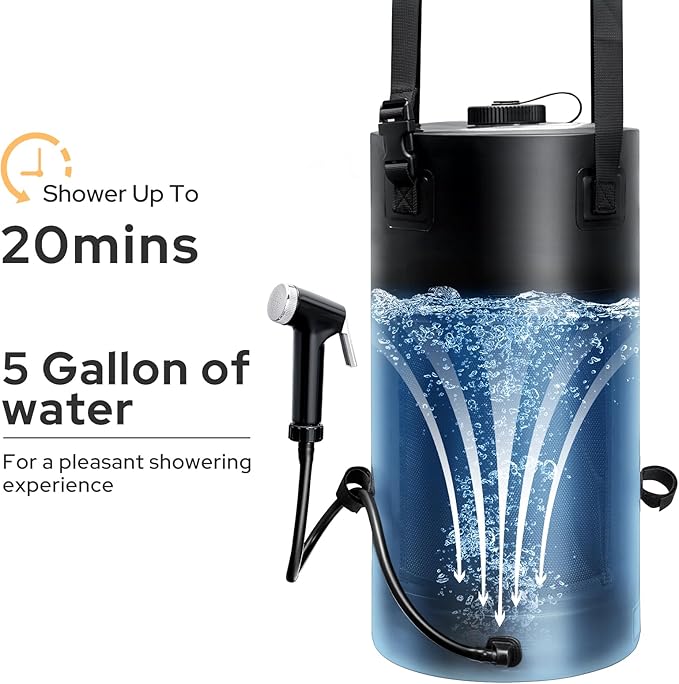 - 【Portable Shower Bag】Capacity up to 5 gallons/20L with a large storage mesh Pocket, lets you enjoy a better and refreshing shower anywhere. compact and lightweight design that you can carry it in luggage, backpack, car trunk.