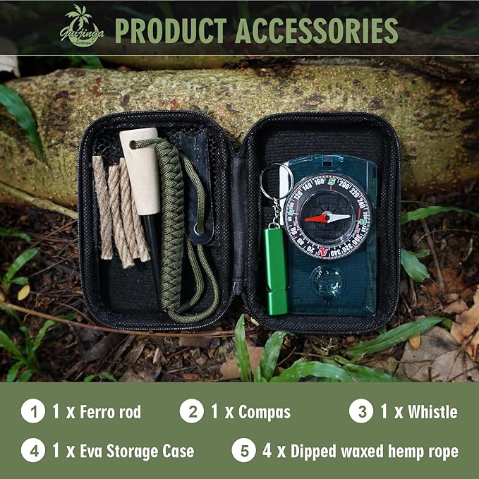 - Included Components : compass, Tinder Rope, whistle, flint starter