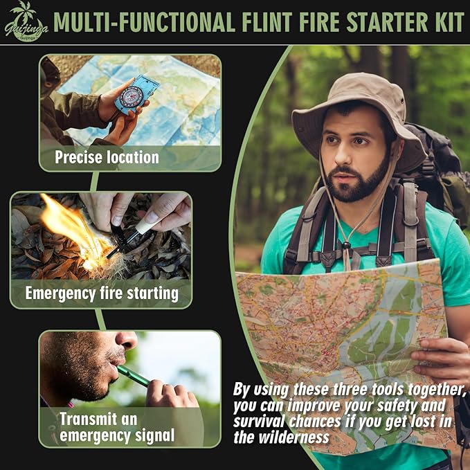 - 🔥【Triple protection】:When you get lost in the wild, the whistle, compass and flint fire starter are very important tools. The compass and whistle help locate and convey emergency information. Proper use of them can help you find the direction and improve your survival ability.