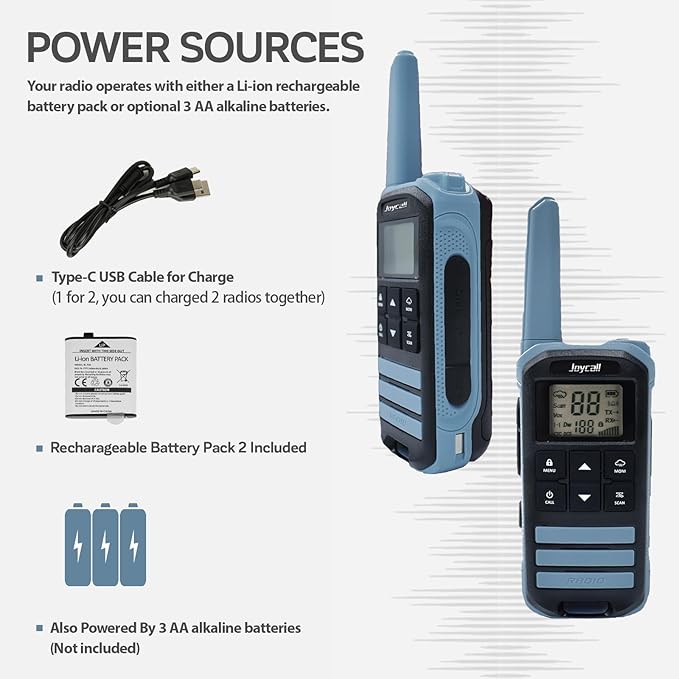 - (📡 Long Range Communication): Joycall two-way radios offer up to 5km range in open areas like plains and coastal regions, with no license required. VOX functionality allows hands-free use, making it perfect for users of all ages.