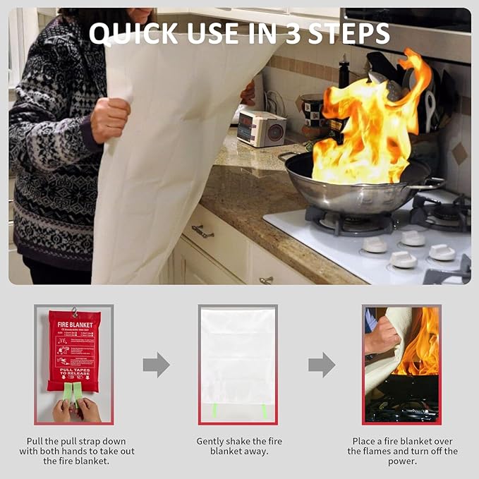 - USE EMERGENCY FIRE BLANKET WITHIN 3 SECONDS : Fix or place the fire blanket on a conspicuous wall or in a drawer where it can be accessed quickly. In the early stage of fire, quickly take out the fire blanket, hold the two straps with both hands, gently shake the fire blanket, cover the flame, and cut off the power or gas source.