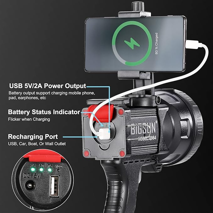 - Rechargeable Battery: The flashlight is powered by a rechargeable lithium battery for long-lasting use.