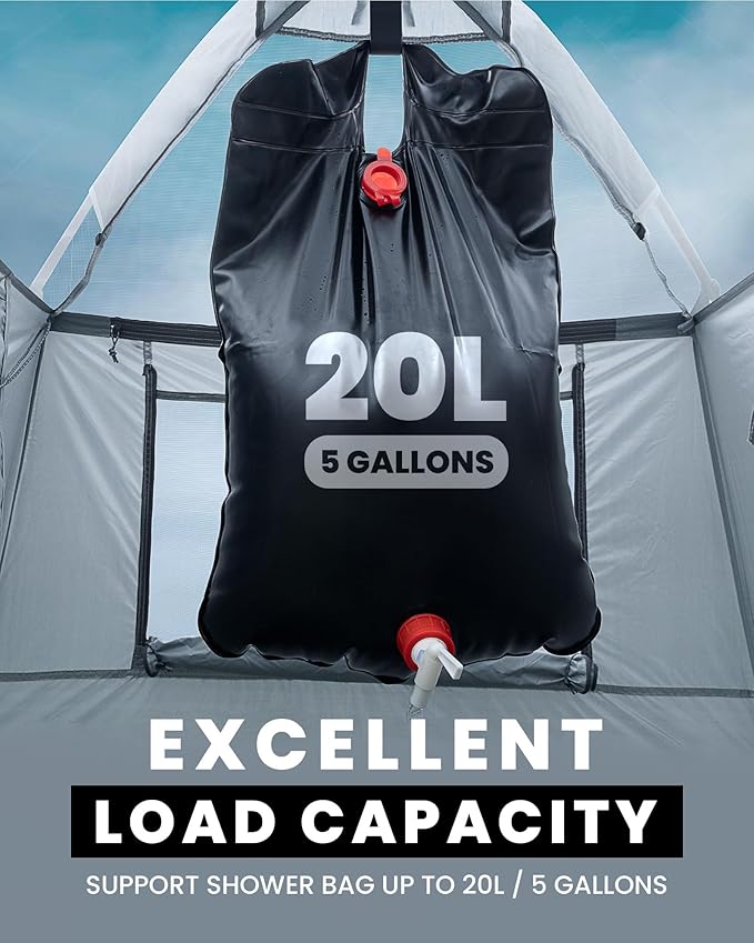 - Durable, Excellent Load Capacity - This shower tent is made of 190T polyester. The removable roof, crafted from PU2000mm polyester, effectively prevents water from entering the tent and provides sun shading. Optimized overall structure and durable top hook can effectively support shower bags up to 20L (5 Gallons), offering a good shower experience. (Bladder and Portable Toilte Not Included)