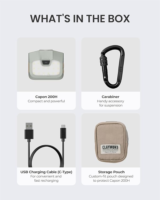 - CLAYMORE CAPON 200H (Mint Gray) - The CLAYMORE Capon 200H is a clip-on light that provides powerful illumination with up to 1,000 lumens, reaching distances of up to 137 yards (125 meters), making it perfect for night work, fishing, hiking, and running.