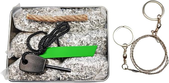 - Included Components : Tin Can, Magnesium, Wax ropes, Ferro Rod, striker, Saw Wire