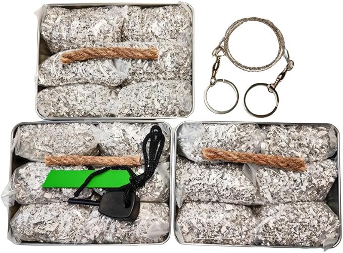 Emergency Fire Starter Magnesium 6 Bags Wax Infused Jute Rope Ferro Rod Striker Saw Wire for Camping Hiking Bushcraft Hurricane + Tin Container