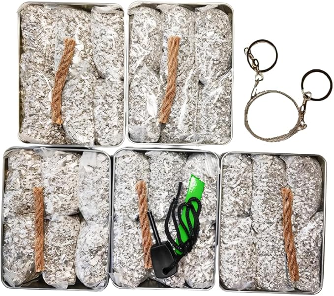 Emergency Fire Starter Magnesium 6 Bags Wax Infused Jute Rope Ferro Rod Striker Saw Wire for Camping Hiking Bushcraft Hurricane + Tin Container