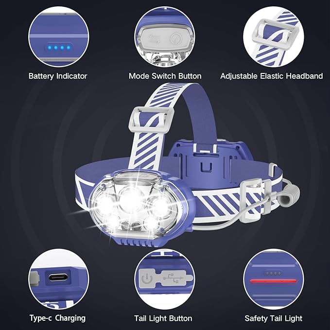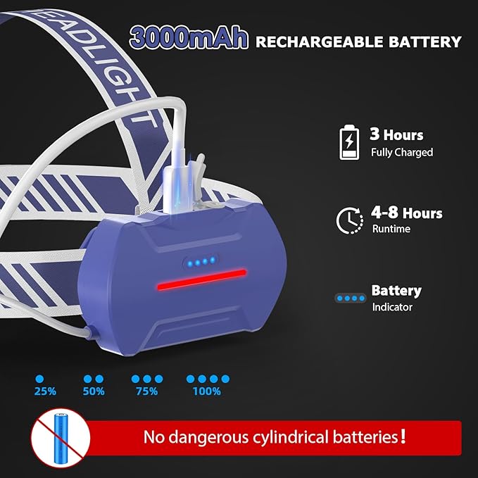- USB Rechargeable and Long Battery Life: Do not use unsafe cylindrical batteries! Our rechargeable headlamp usa built-in rechargeable batteries to ensure your safety first. Our head lamps support Type-C USB charging, making it convenient for everyday use. The headlamp rechargeable can provide 4-8 hours of long-lasting power in different lighting modes, so you can adventure without worrying about running out of juice