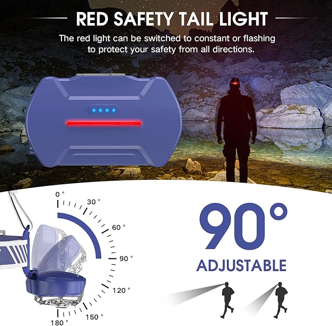- Adjustable Angle and Comfortable Headband: To ensure flexible lighting, our head lights for forehead can be adjusted 90°. And the hands-free headlamp provides bright and steady lighting while you work. The headlights for head use a soft and comfortable elastic headband that can be adjusted to fit different head size, perfect headlamps for adults and kids. Only weight 4.8 OZ, it's comfortable to wear for long time, ensuring you can explore with ease.The band can be taken off to wash