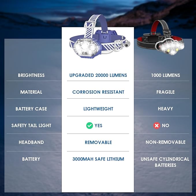 - Illuminate Your World in All Directions: Designed in the USA, MIOISY head lamp features 5 powerful XPG and LED bulbs that provide up to 20000 lumens max, ensuring that you can see everything around you clearly. Perfect for exploring caves, night running, cycling, fishing, camping, construction work and other outdoor adventure activities. The red safety warning light switch is located on the back battery compartment to ensure all direction safety and emergency response