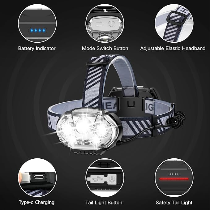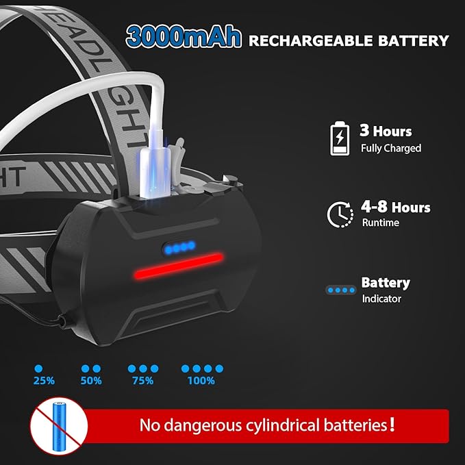 - USB Rechargeable and Long Battery Life: Do not use unsafe cylindrical batteries! Our rechargeable headlamp usa built-in rechargeable batteries to ensure your safety first. Our head lamps support Type-C USB charging, making it convenient for everyday use. The headlamp rechargeable can provide 4-8 hours of long-lasting power in different lighting modes, so you can adventure without worrying about running out of juice