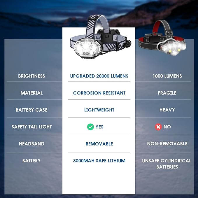 - Illuminate Your World in All Directions: Designed in the USA, MIOISY head lamp features 5 powerful XPG+LED bulbs that provide up to 20000 lumens max, ensuring that you can see everything around you clearly. Perfect for exploring caves, night running, cycling, fishing, camping, construction work and other outdoor adventure activities. The red safety warning light switch is located on the back battery compartment to ensure all direction safety and emergency response