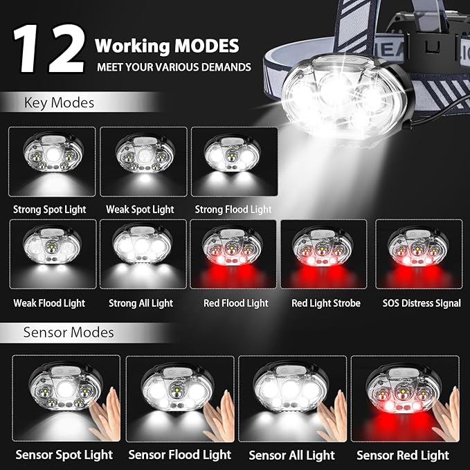 - IPX4 Waterproof and 12 Modes for Any Situation: Our headlamp flashlight is built to withstand splashes of water from all angles, so you can take it on any weather, rain or shine. The head light has 12 modes controlled by 2 buttons. One button switch 8 key modes, the other button switch 4 sensor modes. Our led headlamp is the ultimate adaptable tool for any situation, ensuring you have the right light for any adventure