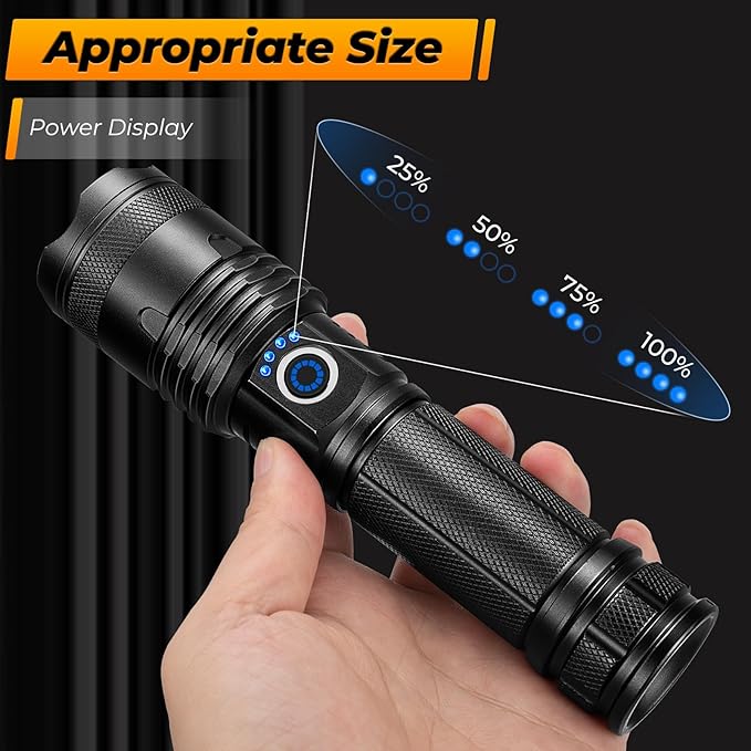 - Power Display - Our rechargeable flashlight has a power lights, an indicator represents 25% power, it will remind you to charge the flashlight in time. Please do not charge after the battery runs out, which will affect the performance of the flashlight.