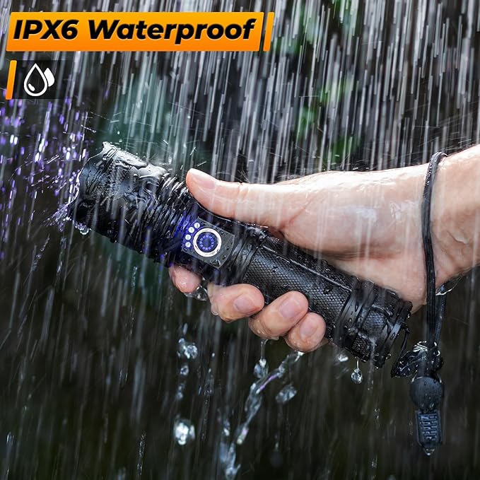 - IPX6 Waterproof - Our waterproof flashlights are IPX6 waterproof, so when you're camping in the wild, you don't have to worry about the flashlight getting wet and then affecting its performance.