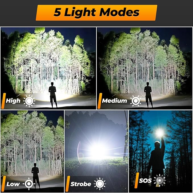 - 5 Light Modes - The powerful flashlight has 5 light modes, High - Medium - Low - Strobe - SOS. You can choose the appropriate light mode according to the usage scenario.
