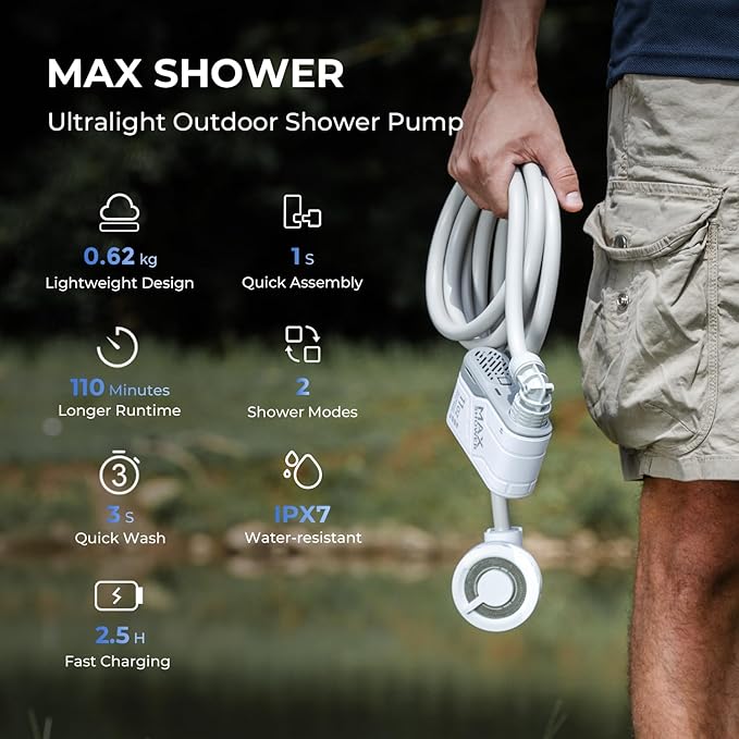 - ➤【Versatile Applications】: Featuring an 18.5 Wh battery and IPX7 water resistance, this compact shower pump with a collapsible hook is ideal for outdoor activities such as camping, car washing, pet cleaning, and more. Its versatility extends to traveling, hiking, road trips, and fishing, ensuring reliable performance wherever you go