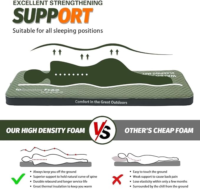 - Adjustable Support with Self Inflating Sleeping Pad : This pad features a unique combination of foam and air, making it fully adjustable for personalized softness and support. This means you can easily adjust the comfort of the mattress according to your preferences, providing you with the best sleeping experience. Compared to camping mattress made of a single material like foam or memory foam, this mattress offers a higher level of personalization and comfort.
